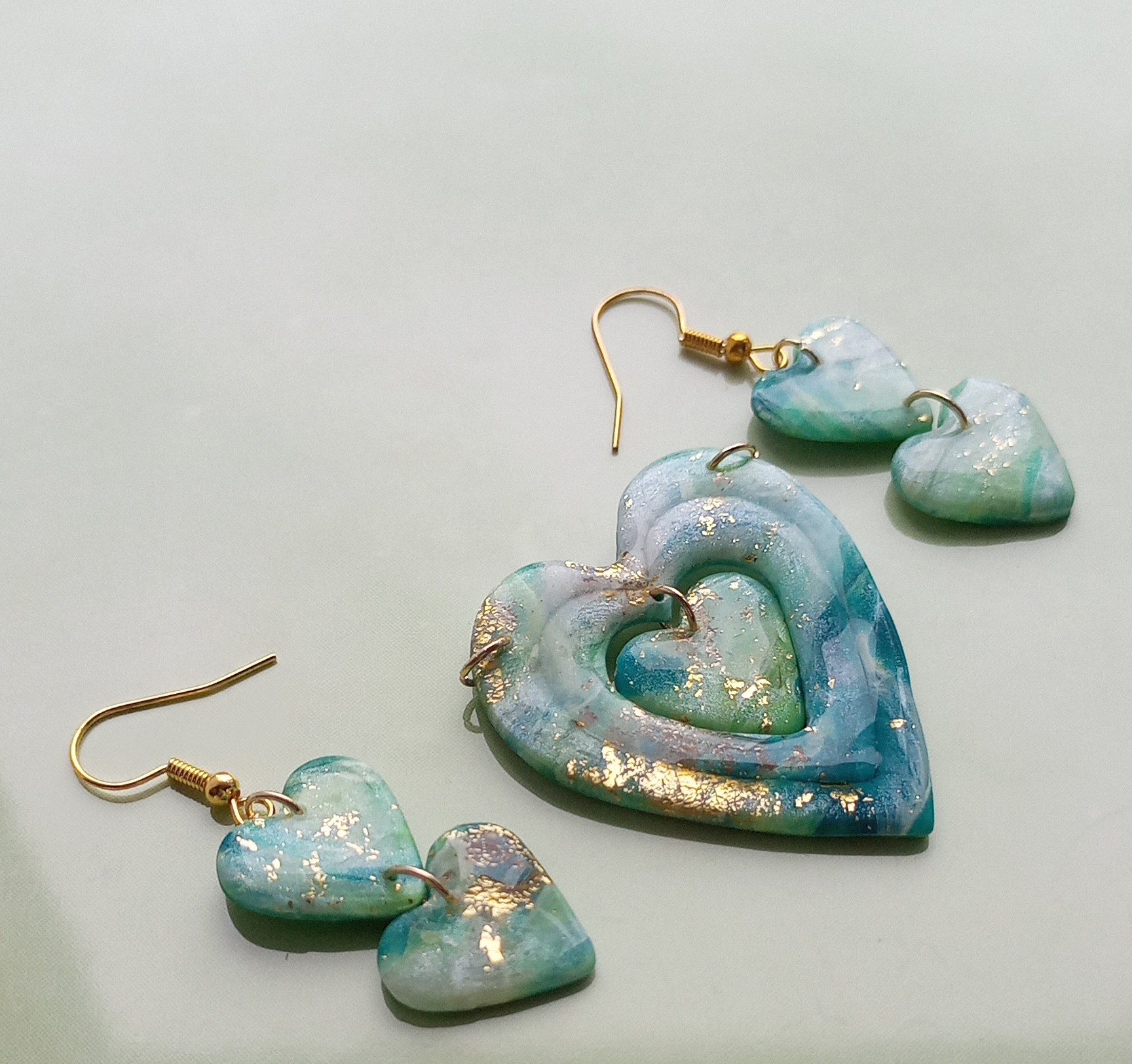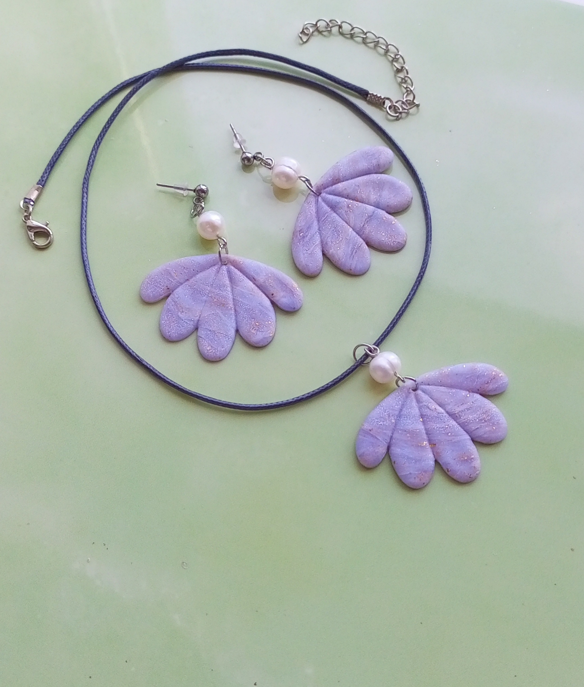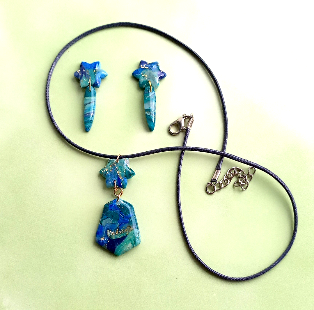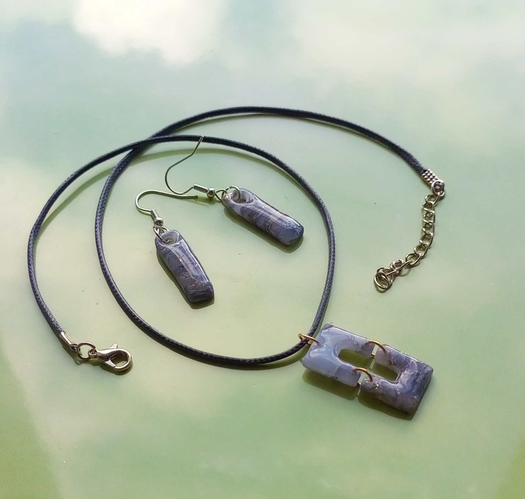 Серый камень символизирует стойкость, элегантность и тайну. Он придает образу изысканность и загадочность, притягивая внимание окружающих. Нежные серо-голубые оттенки полимерной глины, с которой созданы серьги и подвеска, добавляют дополнительного шарма и привлекательности.