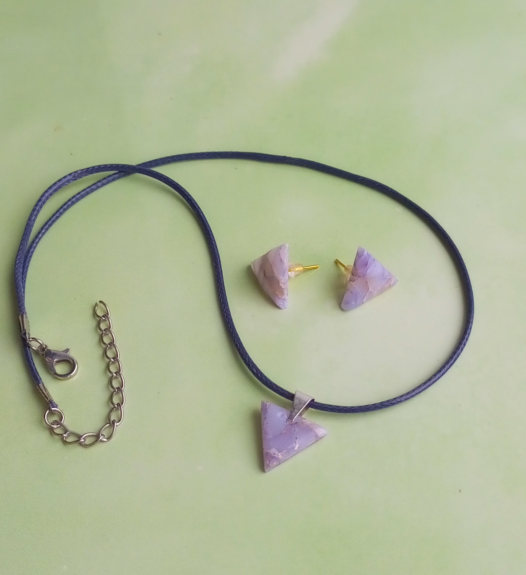 Подвеска в форме серого треугольника из полимерной глины является прекрасным дополнением к набору. Она прикрепляется к изящной цепочке и обладает теми же уникальными чертами, что и камень. Сочетание серого камня и подвески создает гармоничный образ, который будет привлекать восхищенные взгляды и стать ярким акцентом вашего наряда.
